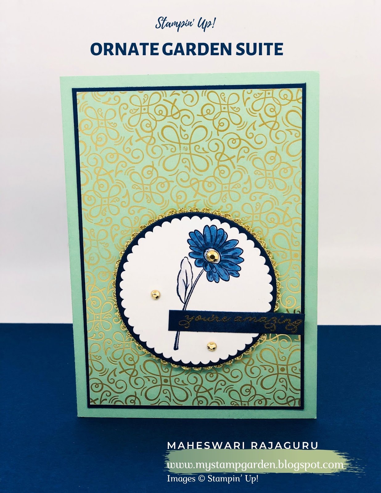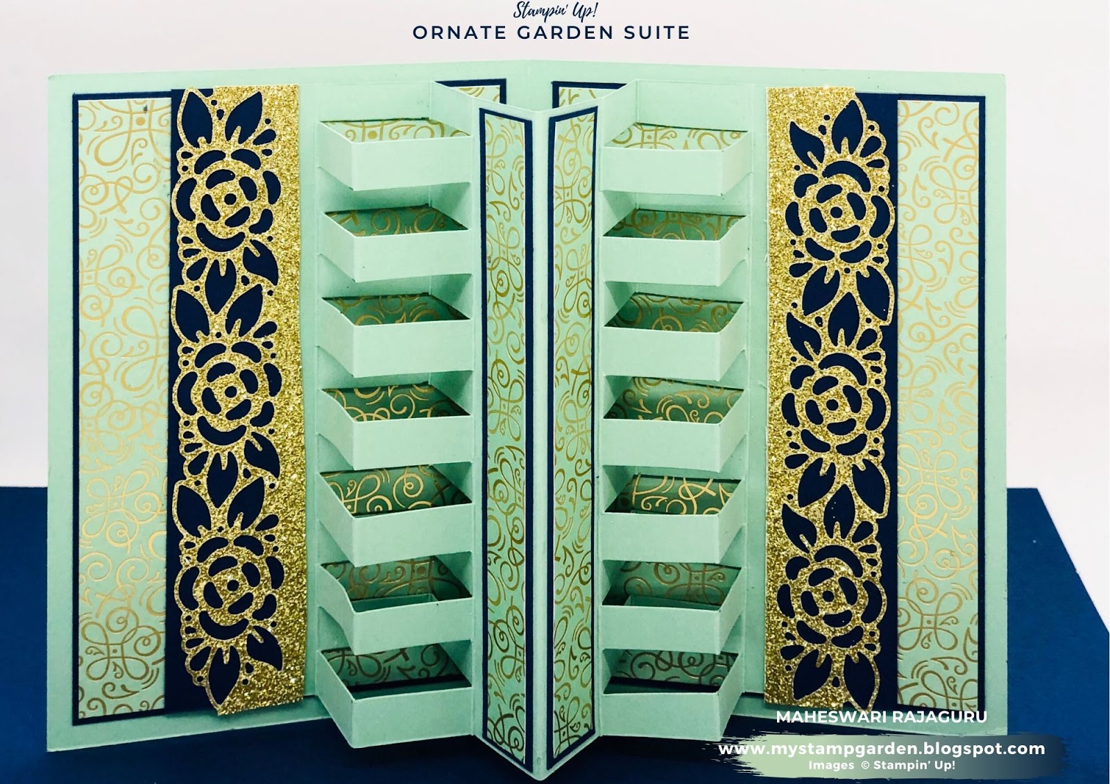 Today’s card using Stampin’ Up! Ornate Garden suite. I saw the picture of the Tower Card in the Pinterest which inspired me to create my own Centre Tower folding card.