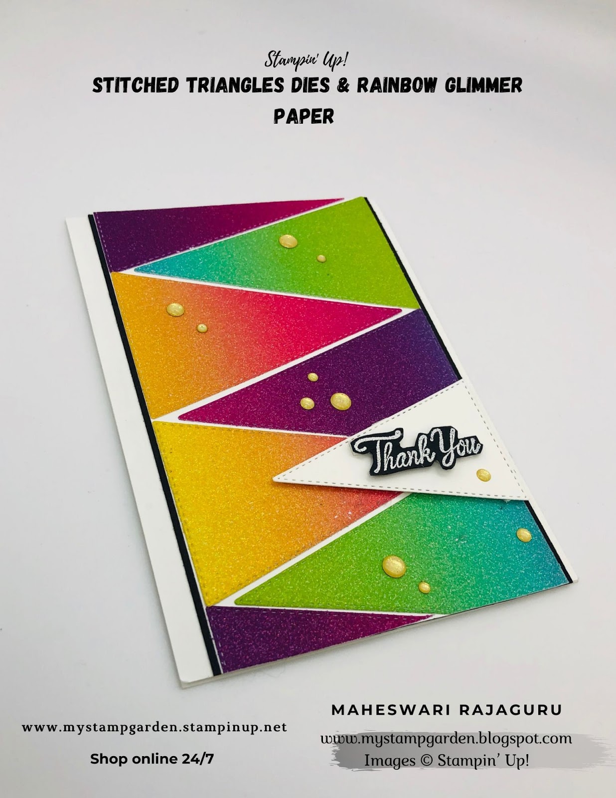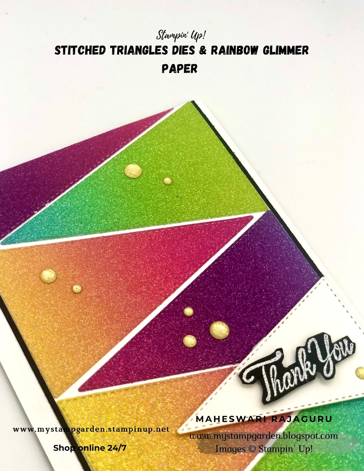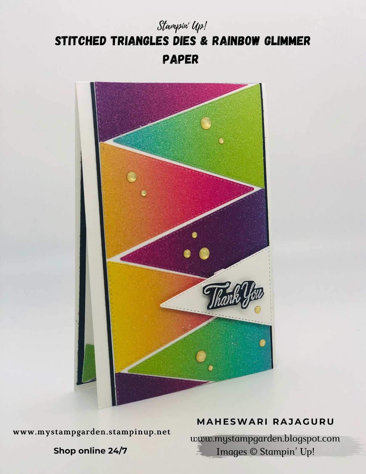 Welcome to My blog. My today’s card using Stampin’ Up! “Stitched Triangle ” dies and the Beautiful Rainbow Glimmer paper. I used the Thank you sentiment from the Parcels and Petals stamp set.