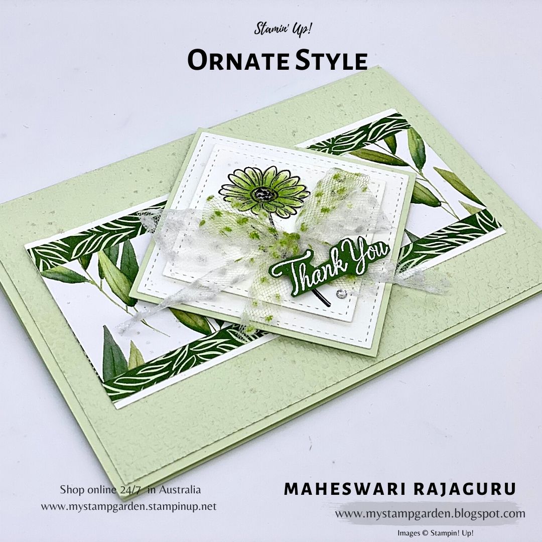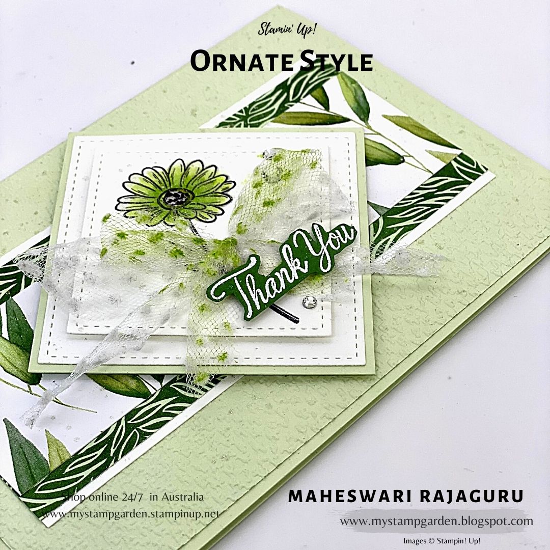 I used Stampin’ Up! ‘ Ornate Style ‘ Stamp set and ‘ Parcels & Petals’ stamp set for the sentiment.