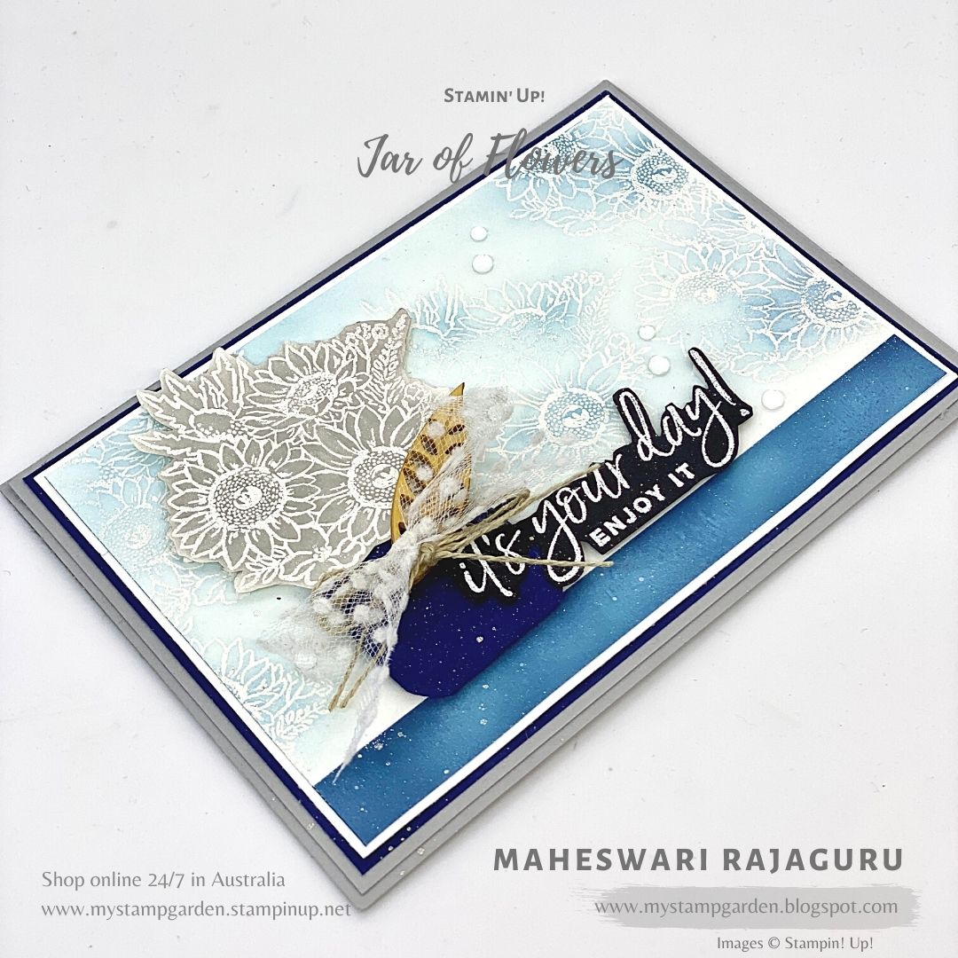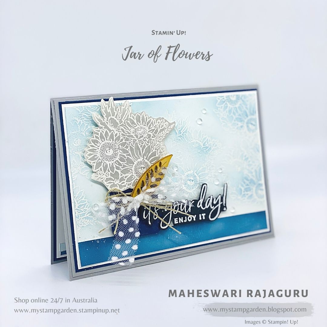 I used Stampin’ Up! ‘ Jar of flowers’ for the image and ‘ Happiest of Birthdays’ for the Sentiments.