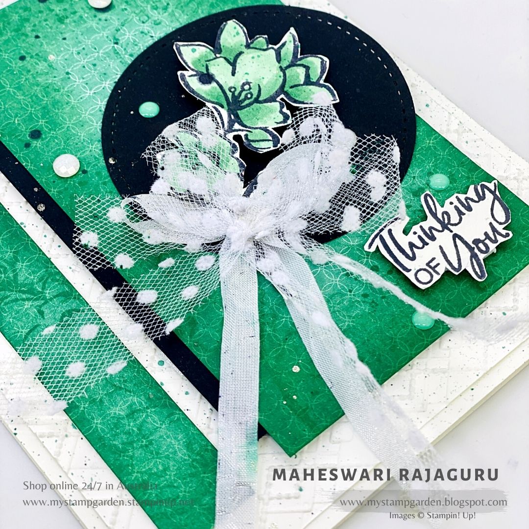 - Colored the image using light and Dark shade of Just Jade Stampin’ Blends and attached on top of the die-cut piece using Stampin’ Dimensionals.