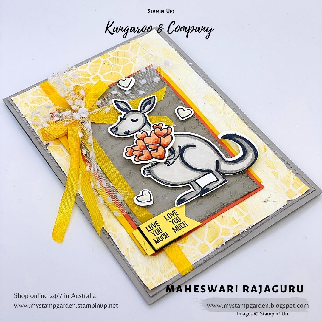 I used the Stampin’ Up! ‘Kangaroo & Company ‘ stamp set and I used the beautiful Fine Art Floral Designer Series Paper from the New Mini Catalogue 2021.