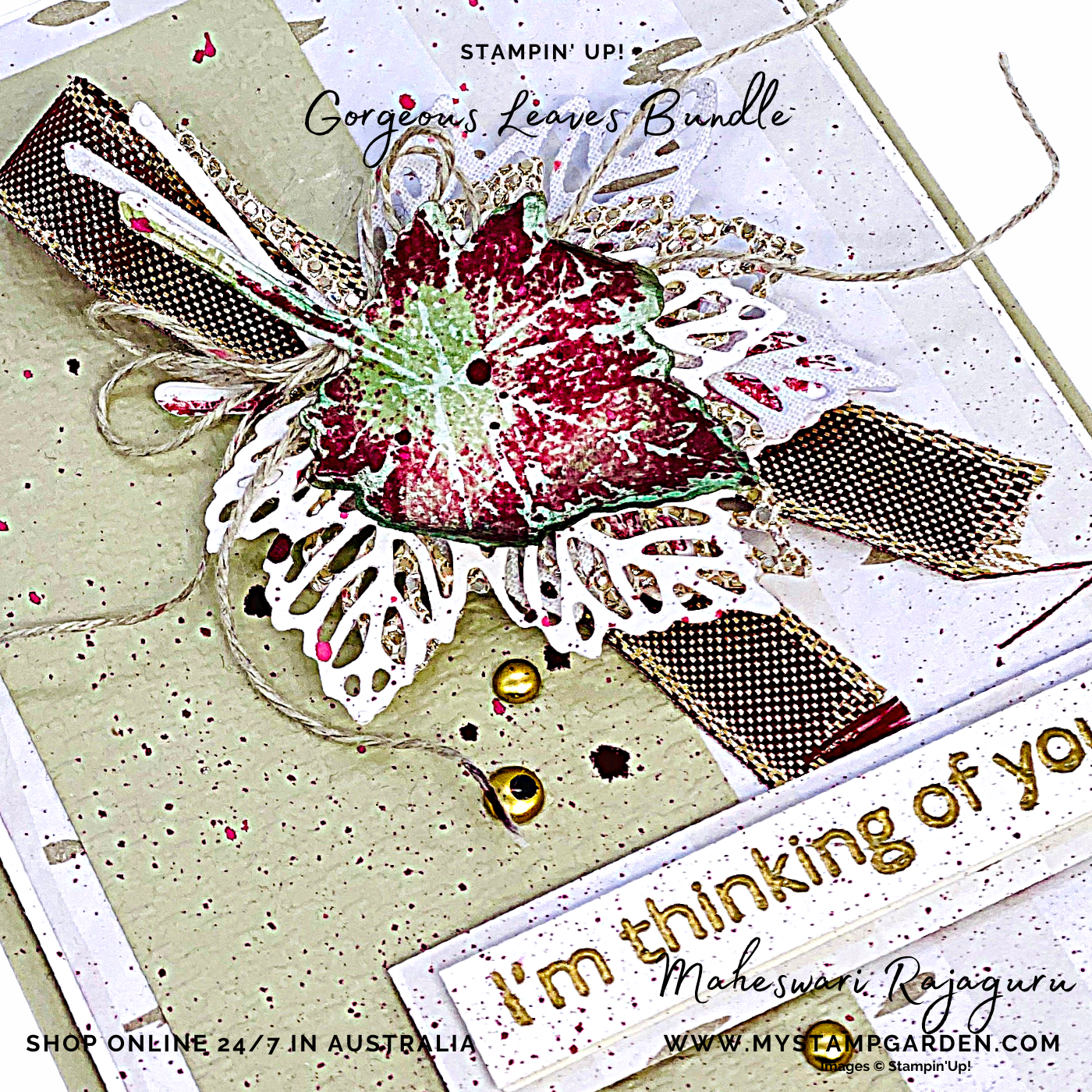 Added double bows using linen thread next to the leaves using glue dots. Stamped the sentiment using Versamrak Inkpad and used Stampin’ Gold embossing powder. Then adhere it to the card using Stampin’ Dimensionals.