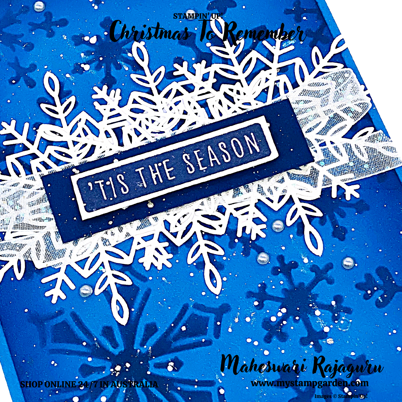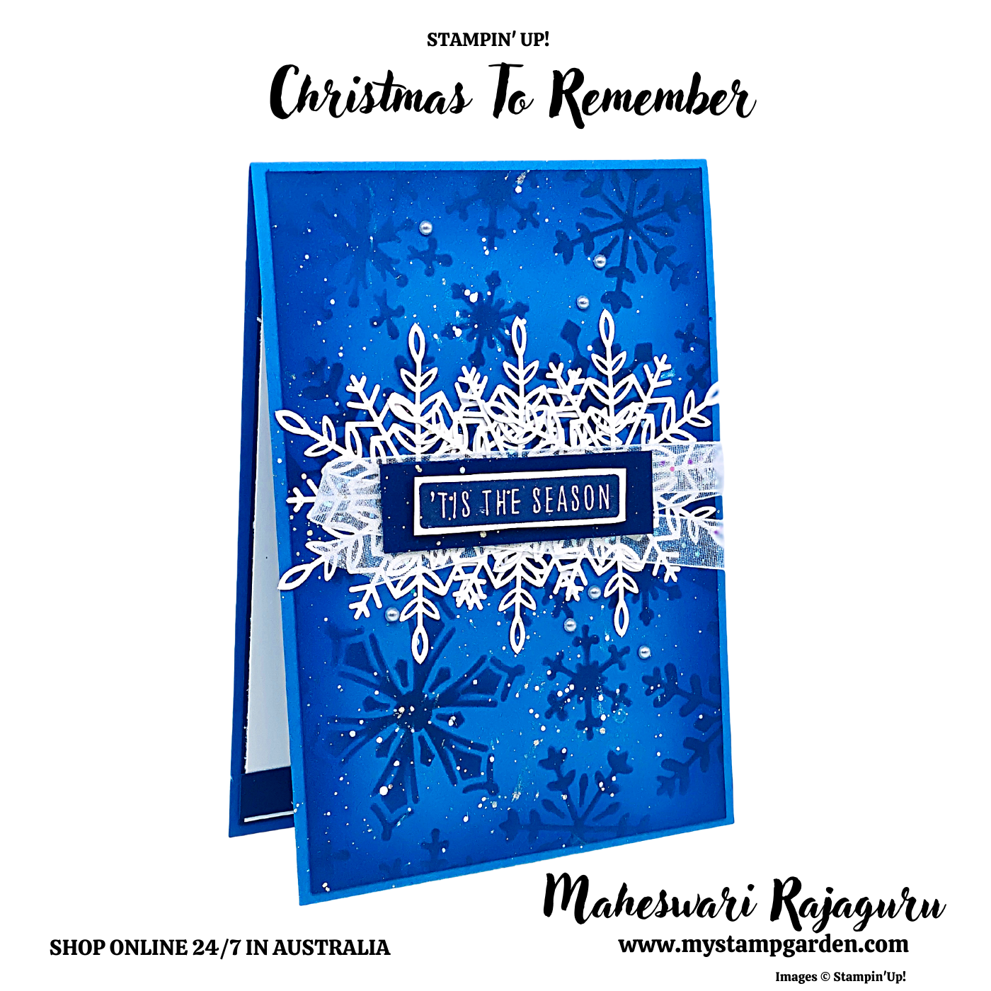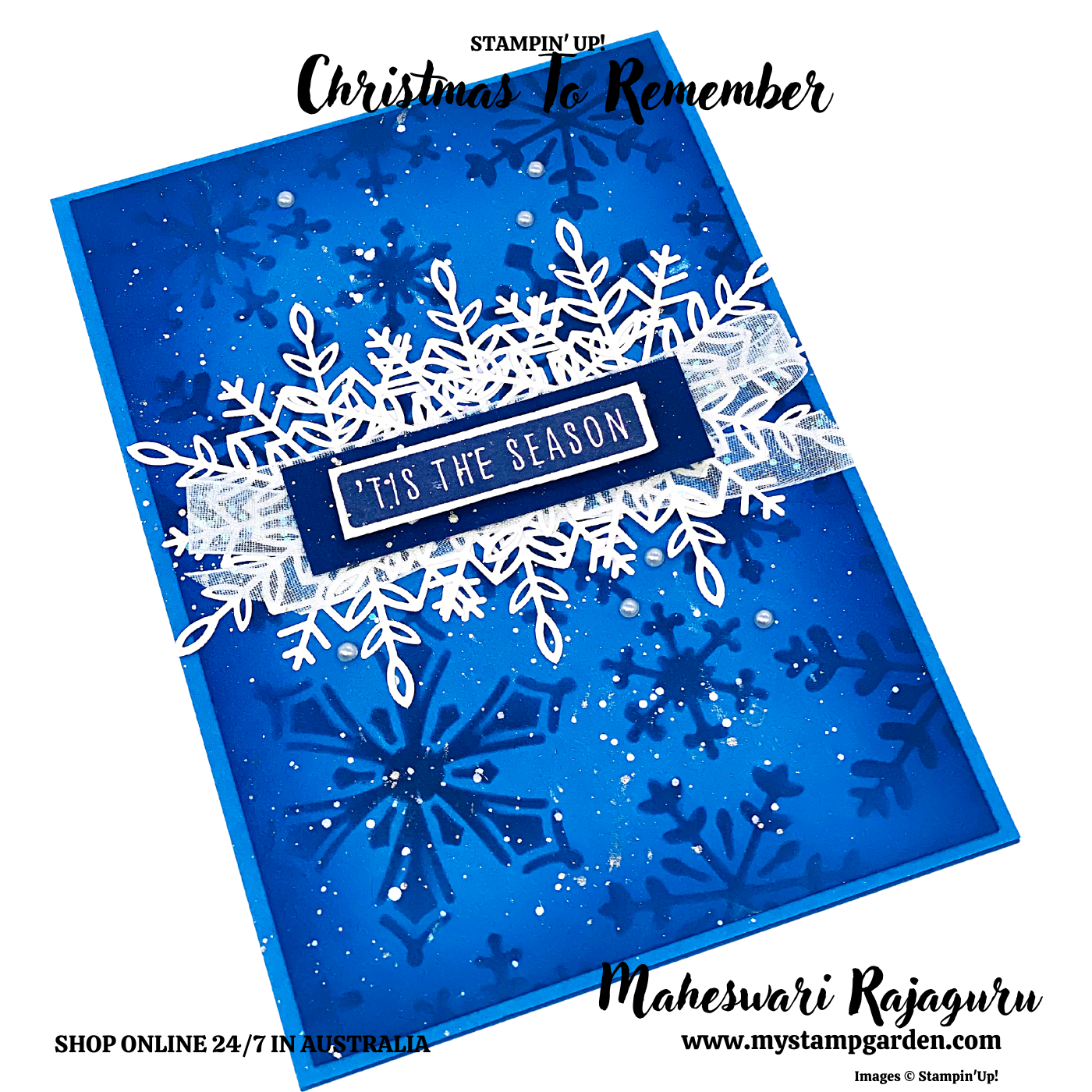 I selected the season of winter. I used the Stampin’ Up! ‘ Christmas to Rememberer ‘ stamp set and the Snowflakes stencil.
