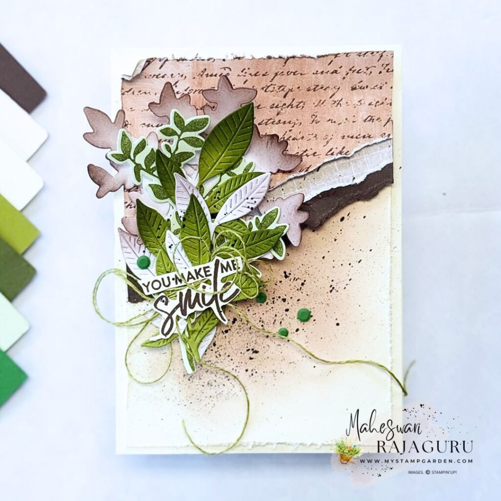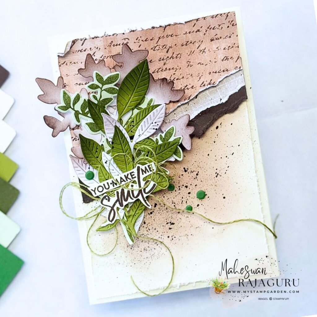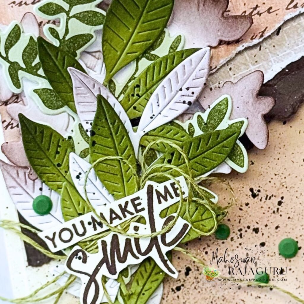 - Stamped one of the leaves on Soft Sea Foam using Mossy Meadow Ink. Splatter the background using Early Espresso Ink with Clear Wink Of Stella.