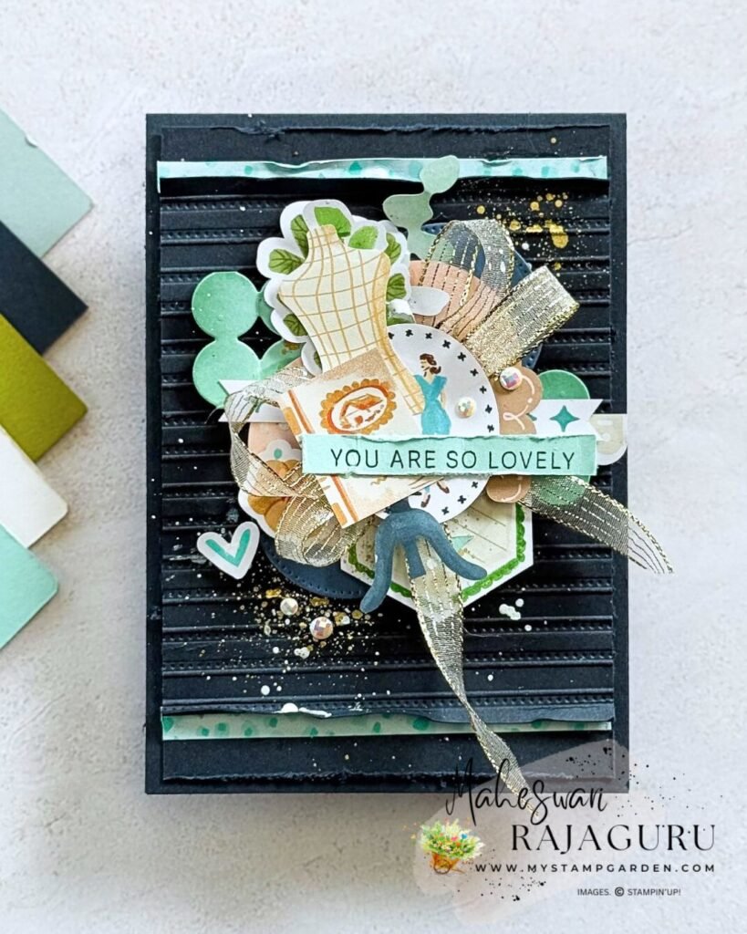 I chose a bright colour palette of Secret Sea, as my base Pool Party, with a touch of gold and for subtle effect I picked Basic Beige with some Old Olive.